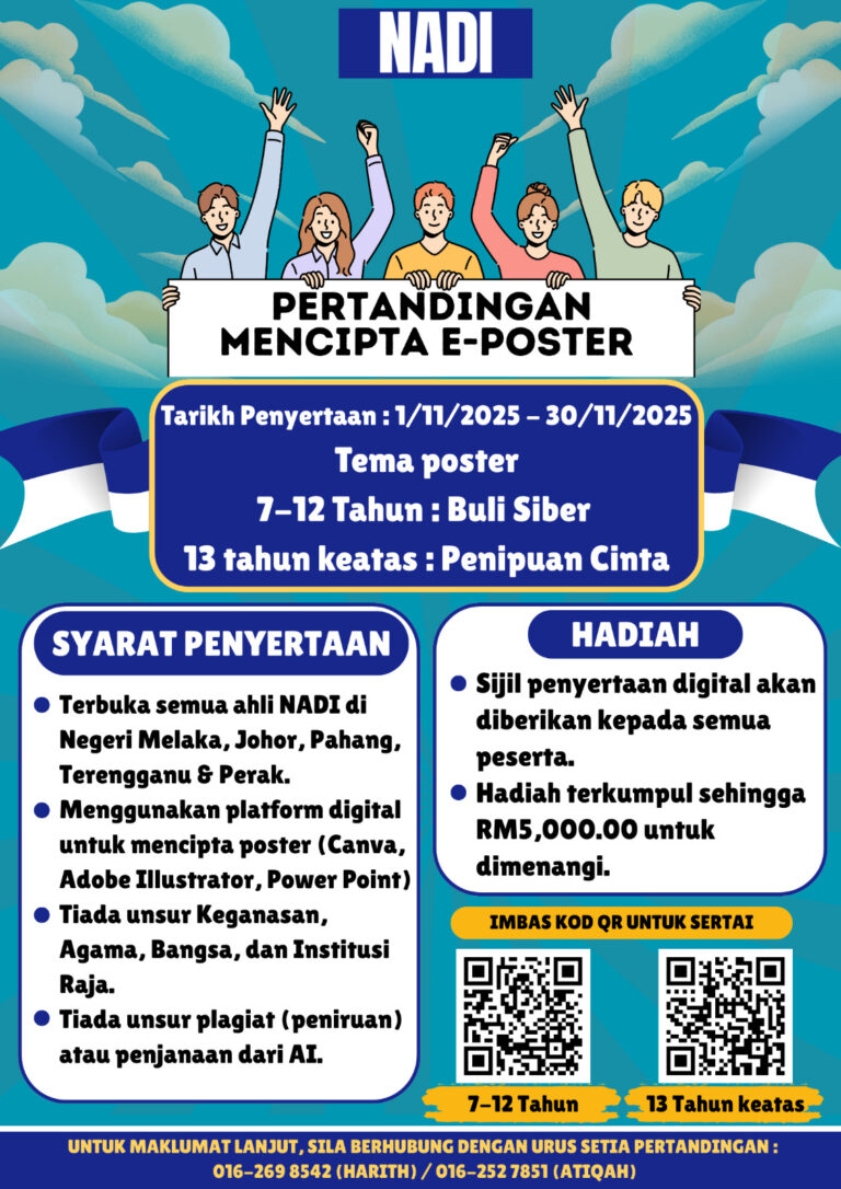 Hebahan Pertandingan Mencipta E-Poster NADI Sukacita dimaklumkan bahawa NADI menganjurkan Pertandingan Mencipta E-Poster NADI 2025 bermula dari 1 November hingga 30 November 2025. Pertandingan ini bertujuan menggalakkan kreativiti serta kesedaran digital dalam kalangan ahli NADI. Tema pertandingan adalah seperti berikut: […]