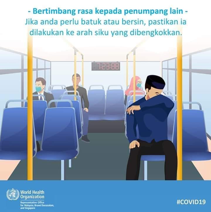 Jika anda perlu batuk atau bersin, pastikan ia dilakukan ke arah siku yang dibengkokkan. Jangan guna telapak tangan untuk tutup mulut ketika batuk atau bersin. Dalam keadaan inilah pentingnya kita memakai pelitup separuh muka ketika berada di tempat awam.