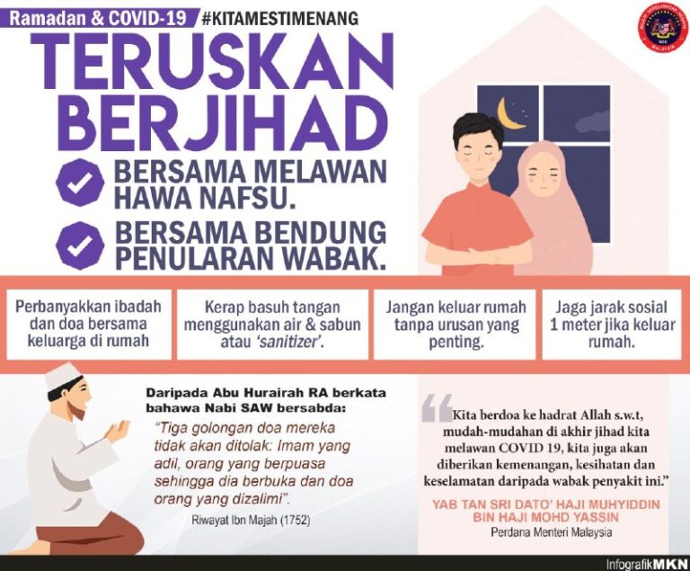 TERUSKAN BERJIHAD Gunakan peluang Ramadan kali ini untuk lakukan aktiviti dan ibadah bersama keluarga di rumah. Sama-sama kita mencegah penularan wabak COVID19.