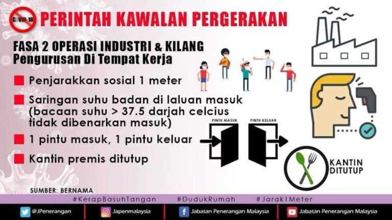 Bagi industri dan kilang yang dibenarkan beroperasi semasa Perintah Kawalan Pergerakan, langkah-langkah berikut perlulah diutamakan. #COVID19#DudukRumah#KerapBasuhTangan#Jarak1Meter#JabatanPenerangan