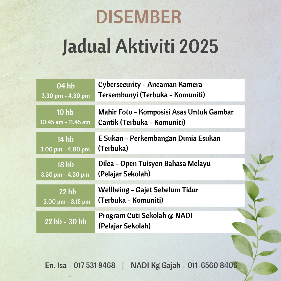 Tarikh 27 Disember 2025 Masa 3.00 pm – 3.30 pm Golongan Pelajar Sekolah Lokasi NADI Kampung Gajah – OBJEKTIF – Meningkatkan kesedaran peserta tentang ancaman penggodaman terhadap komputer riba. Memberi pendedahan mengenai kaedah dan punca berlakunya penggodaman laptop. Membantu peserta […]